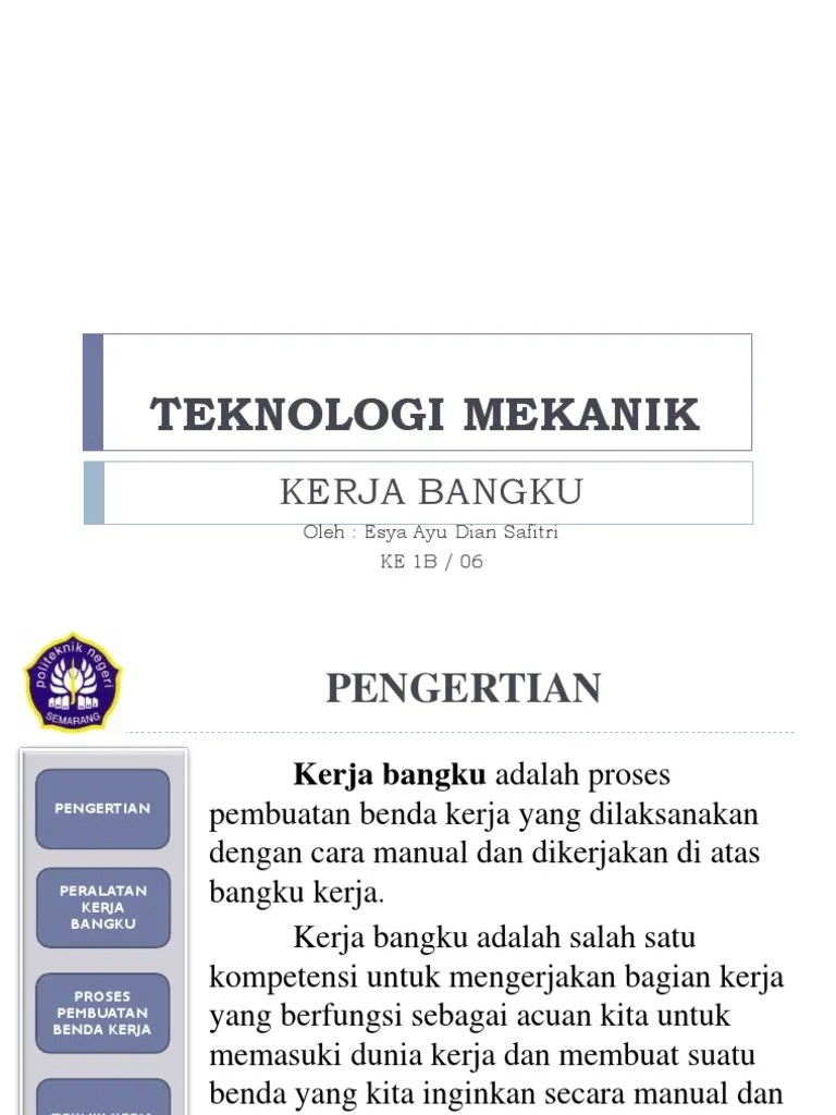 Proses Kerja Bangku - Alat Alat Bengkel Kerja Bangku Mesin Muchammad Lutfi S Blog : Mahasiswa memiliki kemampuan menjelaskan prosedur kerja terkait proses persiapan bahan dan peminjaman peralatan praktik 4.. kerja terkait proses kerja bangku 3. Tingkat kejelasan gambar yang dipergunakan, kualitas peralatan baik alat potong, serut, pahat alat penghalus sangat menentukan hasil produk peralatan tangan untuk kerja bangku dan kerja mesin semi masinal banyak dijumpai di pasaran. Sedang paling banyak dialami oleh praktikan baik pada proses kerja bangku 73,64%, kerja turning/milling 72,73%, kerja assembly 53,64%. Penyimpanan dial indicator secara baik harus bebas dari sinar matahari secara langsung, kelembapan tinggi, dan debu atau kotoran. Laboratorium kerja bangku 120 m2 8 m2 160 m2 tidak memenuhi standar minimum 3.
